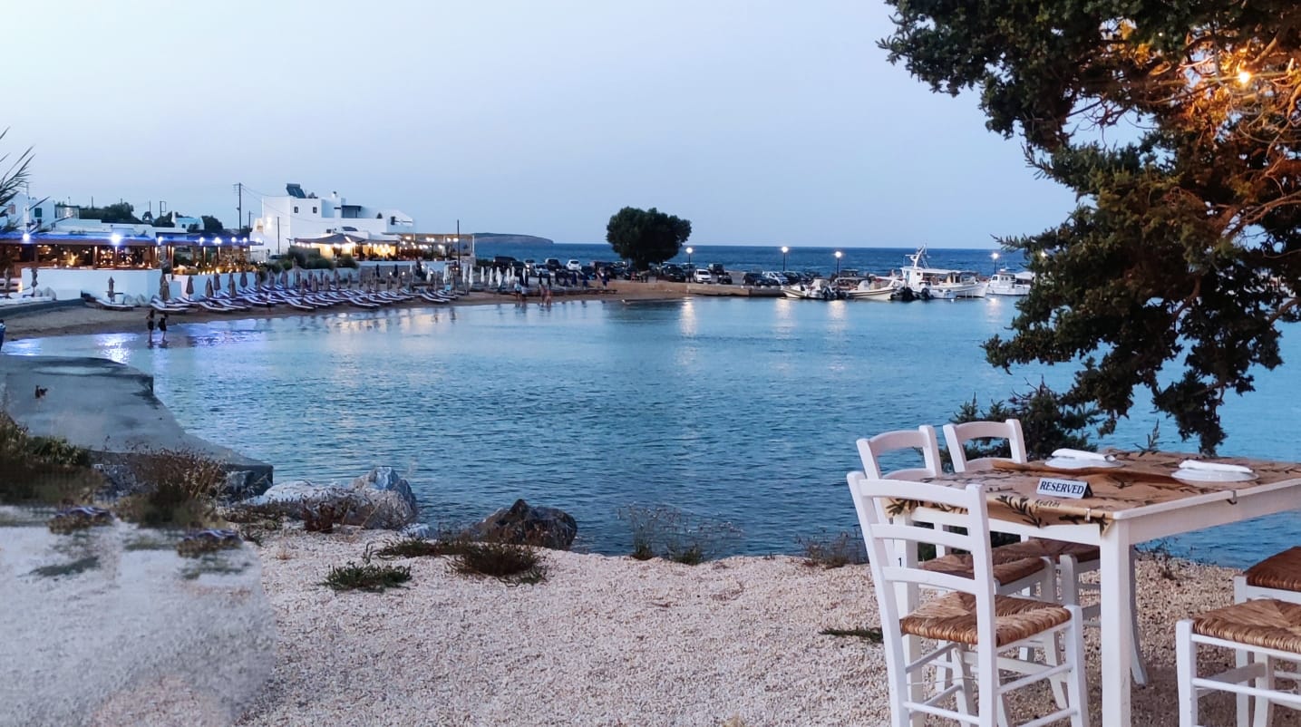 Faragas, au sud de Paros, offre un cadre différent mais tout aussi agréable : une grande plage de sable doré, bordée de végétation, avec une mer calme et protégée du vent par les rochers. L’eau y est particulièrement claire, généralement moins agitée que sur d’autres plages de l’île, ce qui en fait un très bon spot pour la baignade, le snorkeling ou même le kayak. Malgré son côté plus chic, avec beach bar, restaurant et rangées de transats, Faragas conserve des zones plus tranquilles pour poser sa serviette et profiter d’un long bain dans une eau chaude et limpide.