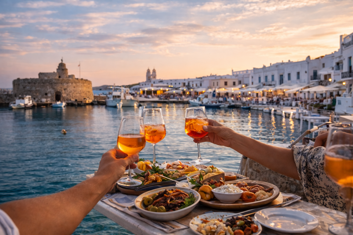 Sur le port même et dans les ruelles adjacentes, tu trouveras une série de cafés, bars à vin et petits restaurants où commander un spritz, un verre de vin blanc de Paros ou un cocktail, accompagnés de mezzés grecs (feta, tarama, poulpe grillé, fava, etc.). L’ambiance est plutôt animée en haute saison, avec parfois de la musique live ou des DJ sets dans certains bars en fin de soirée, tandis qu’en mai‑juin et septembre la sensation est plus « village de pêcheurs chic » mais encore très détendue.
